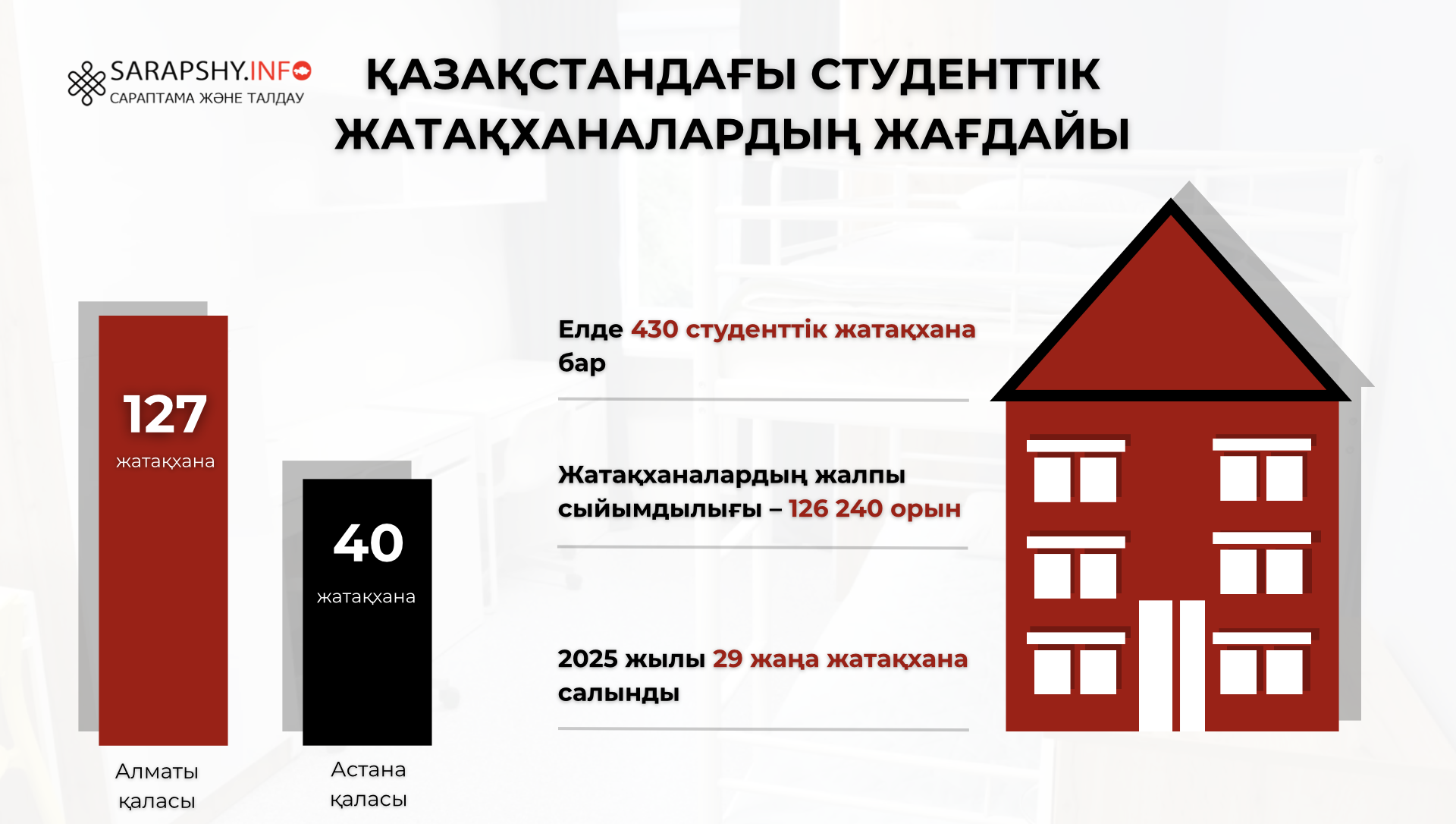 2025 жылы Алматыдағы студенттердің саны 200 мыңға таяды, олардың жартысынан көбі басқа өңірлерден келген. Қазір қалада 127 жатақхана мен 60-қа жуық хостел жұмыс істейді. Қыркүйекке қарай тағы 4 жаңа жатақхана (1 200 орын) ашылмақ.
