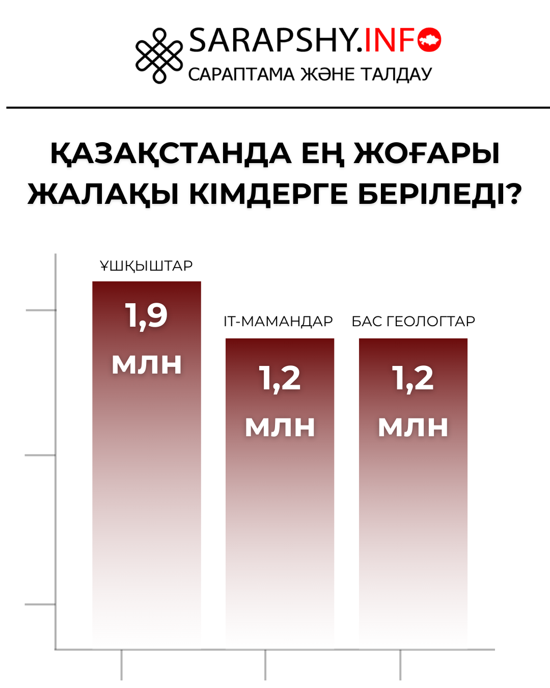 Деректерге сәйкес, елде ұшқыштар айына шамамен 1,9 млн теңге ақша алады. Коммерциялық ұйымдардағы IT бөлімінің басшылары мен бас геологтарға шамамен 1,2 млн теңге көлемінде жалақы ұсынылады.