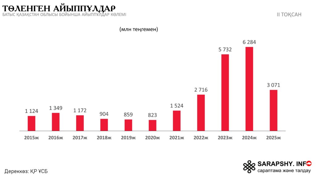 2015 жылы Батыс Қазақстанда көлік иелері төлеген айыппұл көлемі 1,1 млрд теңге болса, 2023 жылы бұл сома 5,7 млрд теңгеге, ал 2024 жылы тіпті 6,2 млрд теңгеге жеткен.