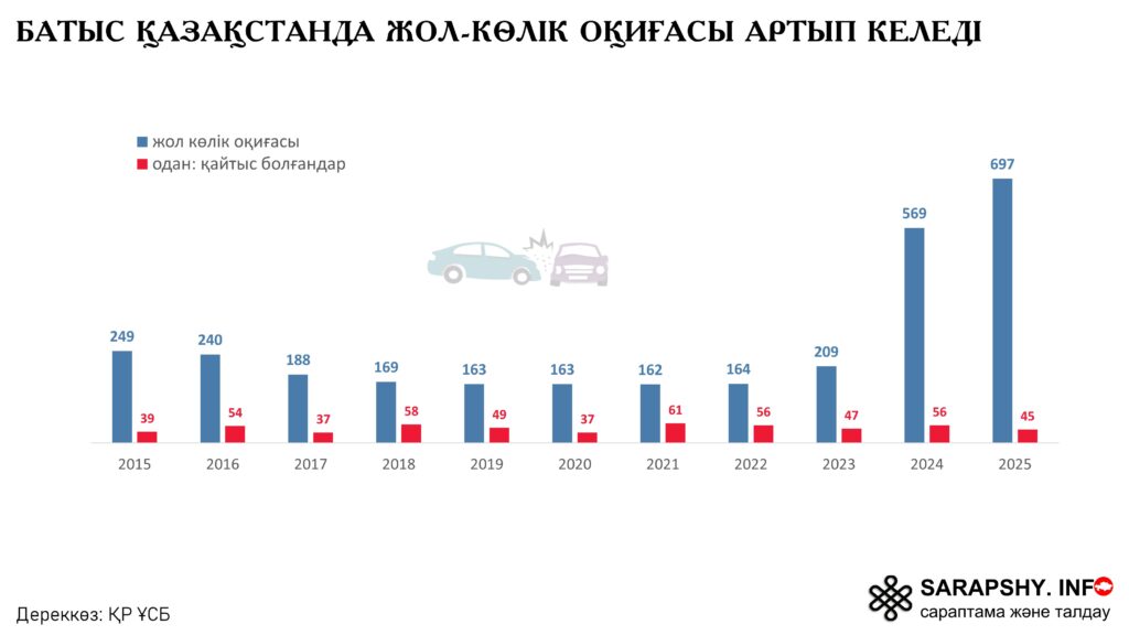 Ұлттық статистика бюросының мәліметі бойынша 2015 жылы өңірде 249 көлік апаты тіркелсе, 2025 жылы бұл көрсеткіш 697-ге дейін шарықтаған. Яғни он жылда апат саны үш есеге жуық көбейген.