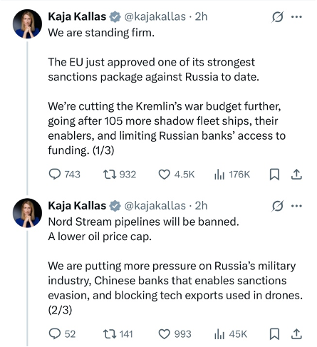 Калластың айтуынша, бұл – ЕО қабылдаған ең қатаң санкциялардың бірі. Жаңа пакет Кремльдің әскери бюджетін қысқартуға, Ресейдің мұнайдан түсетін табысын азайтуға және оның “көлеңкелі флотына” тосқауыл қоюға бағытталған.