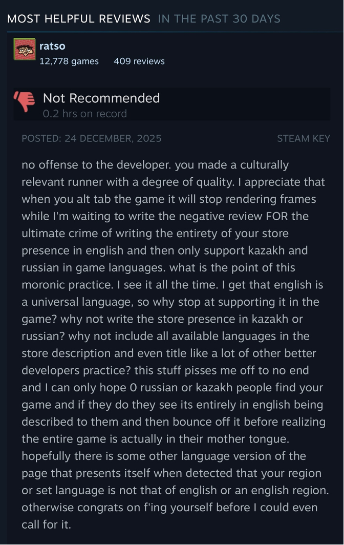 «Ойынды әзірлеген тарапты ренжіткім келмейді, бірақ ойын интерфейсі толық ағылшын тілінде болып, ал ойынның кей элементтері қазақ тілінде екені түсініксіз шешім деп білемін. «, — делінген хабарламада.